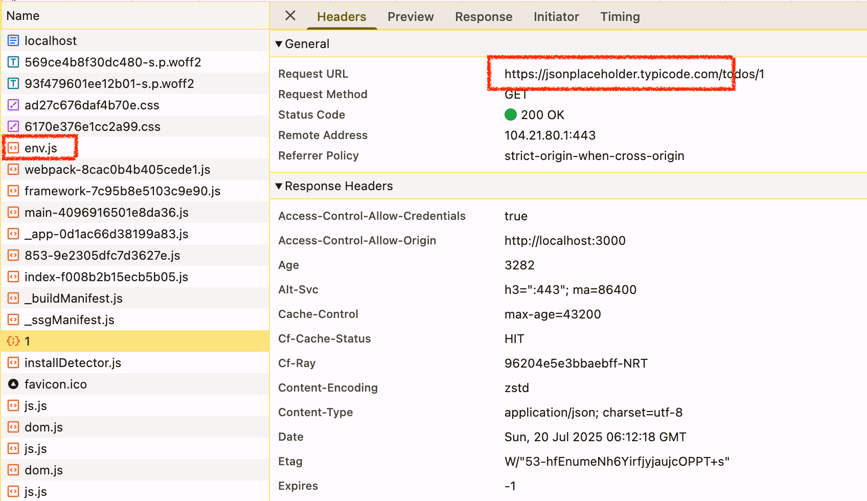getAPIEndpoint() 함수를 호출해서 API 경로를 가져오는 걸 확인할 수 있습니다. 이제 빌드 후 실행해봅시다. Next.js에서는 개발 서버와 production 빌드 서버 사이의 동작이 다른 경우가 있으므로 확실히 확인하기 위해서는 npm run buildnpm run start를 하도록 합니다.